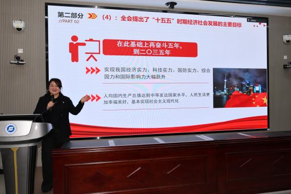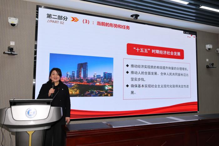 宣讲会上,党委书记邵艳秋系统介绍了全会召开背景、参会人员、主要议程以及全会审议通过的“十五五”规划建议等核心内容。她既从“十五五”时期发展指导原则、目标任务等维度展开阐释,也对全会在国家安全、全面从严治党等方面的部署要求进行解读。她结合学院实际,要求全体师生将全会精神与学科实践紧密结合,以实际行动助力“十五五”规划落地实施。