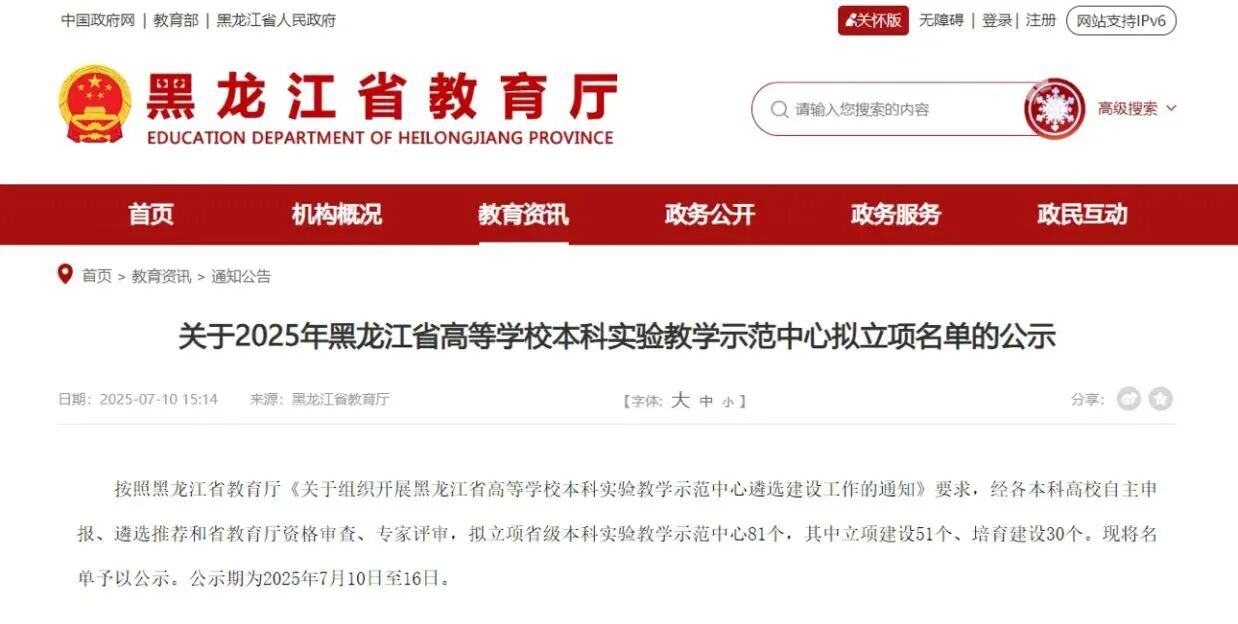 近日,黑龙江省教育厅公示2025年黑龙江省高等学校本科实验教学示范中心拟立项名单,其中拟立项省级本科实验教学示范中心共81个(含立项建设51 个、培育建设30个)。我校申报的“化学实验教学中心”成功入选培育建设名单,这是化学化工学院在实验教学平台建设领域取得的重要突破。
