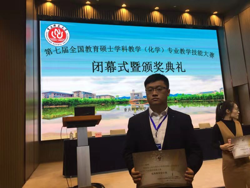 本次大赛分为初赛和决赛两个阶段,我院推荐的三名硕士研究生中有两人进入决赛,与来自全国各地51所参赛院校的99名选手共聚美丽的“山城”重庆市。本次决赛内容从人教版高中课标《化学》(必修)教材中选取三个课题,每个课题参赛选手需提前准备45分钟完整的教学设计方案,现场抽签确定课题进行10分钟模拟授课,课后进行答辩,由评委打分决定名次。最终,我院杜林林同学获得二等奖,段博欣同学获得优秀教学设计奖,王慧教授获得优秀指导教师奖。